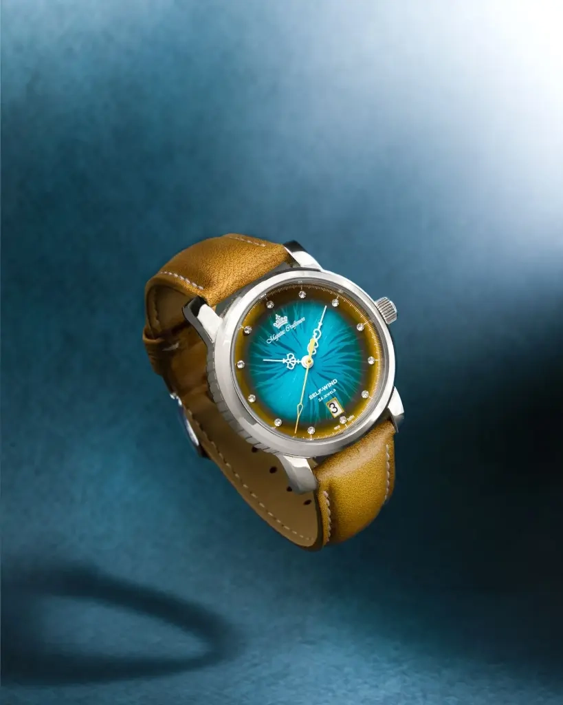The unique 6 o’clock date window complements the design without disrupting the dial’s artistry.