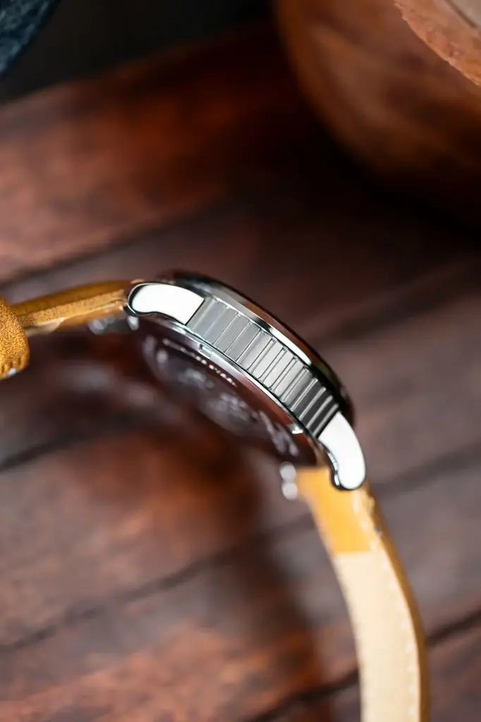 The flat bezel & toughened mineral glass not only provide clarity, scratch resistance but also offer 5ATM water resistance, making it a reliable companion for everyday adventures.