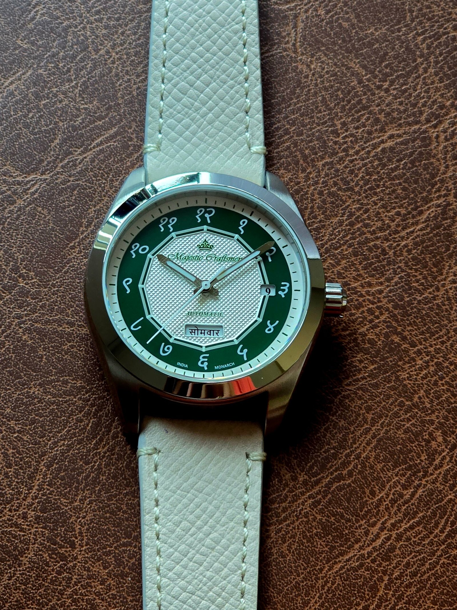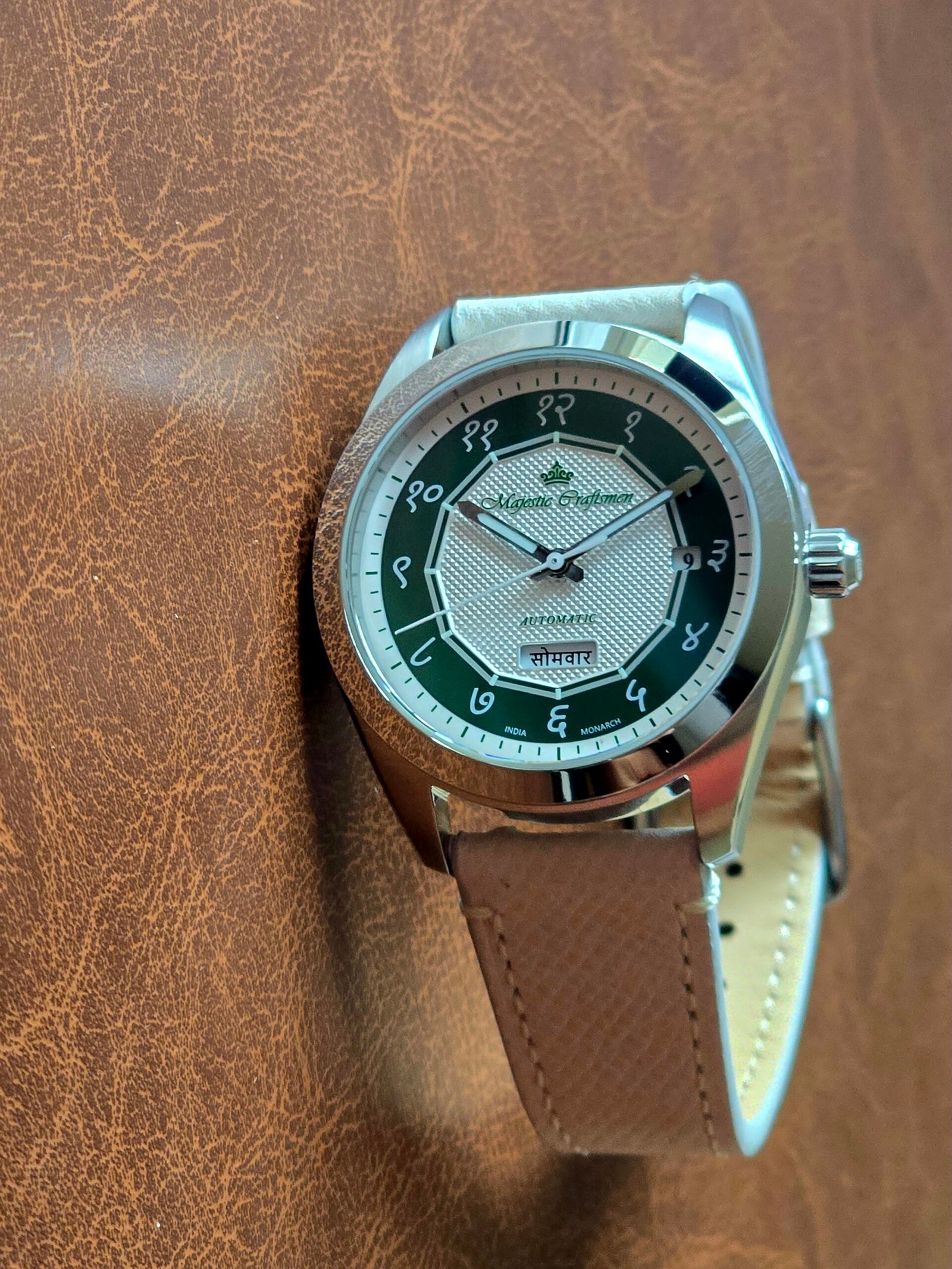 Monarch carries that transformation on its dial: a modern sector design inspired by the Ashoka Chakra, with a hidden lume signature that reveals the wheel after dark.