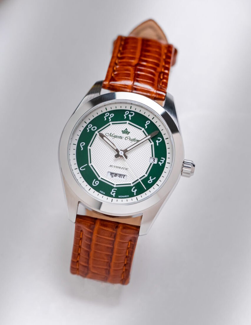 By day, the Monarch’s dial presents a commanding sector layout, which pairs a diamond‑cut inner ring with a clean outer track and sharp, sword‑like hands for crisp legibility. In the dark, rectangular lume markers glow into the spokes of a hidden Ashoka Chakra, a private homage to Emperor Ashoka that only the wearer truly knows. Offered in Bold Italic English numerals or a distinct Devanagari execution – so the language of time feels as considered as the design itself.