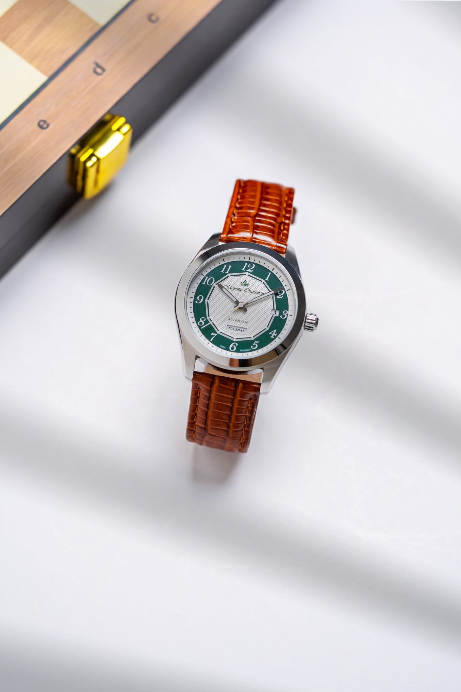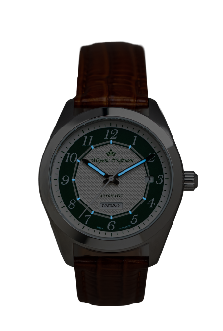 At its core beats a modified Miyota 8205 automatic movement, elevated with a gilt finish that reinforces the watch’s imperial narrative. Visible through the exhibition caseback, the warm golden tones of the calibre echo the richness of royal regalia, turning every glance at the back of the watch into a moment of quiet appreciation. A custom‑engraved rotor bearing the Majestic Craftsmen emblem completes the picture, reminding the wearer that this is not a generic engine, but a heart tuned specifically for the Monarch.