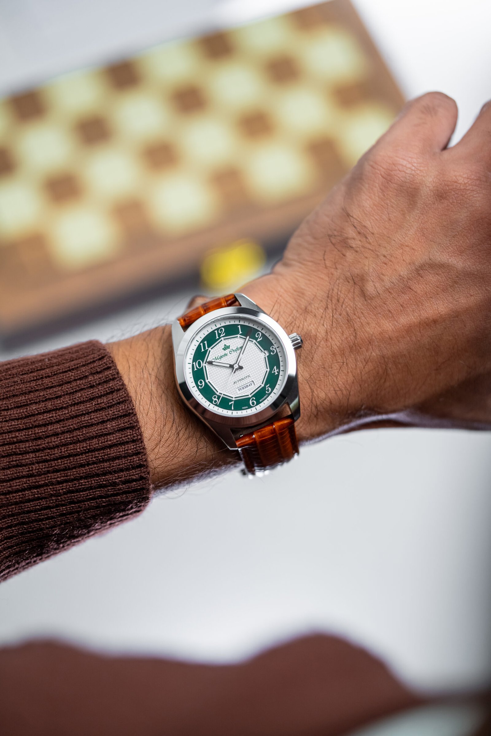 Monarch carries that transformation on its dial: a modern sector design inspired by the Ashoka Chakra, with a hidden lume signature that reveals the wheel after dark.